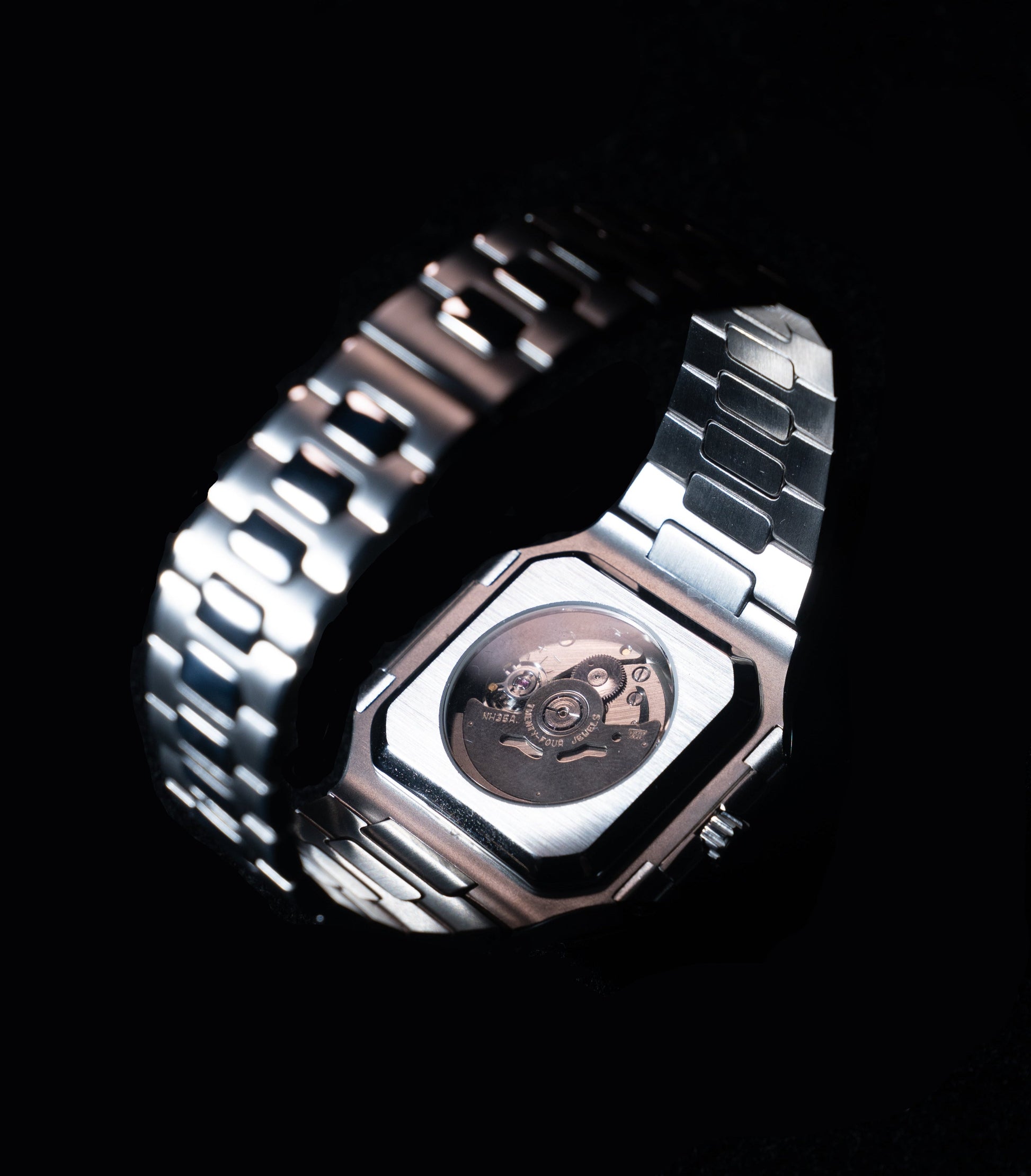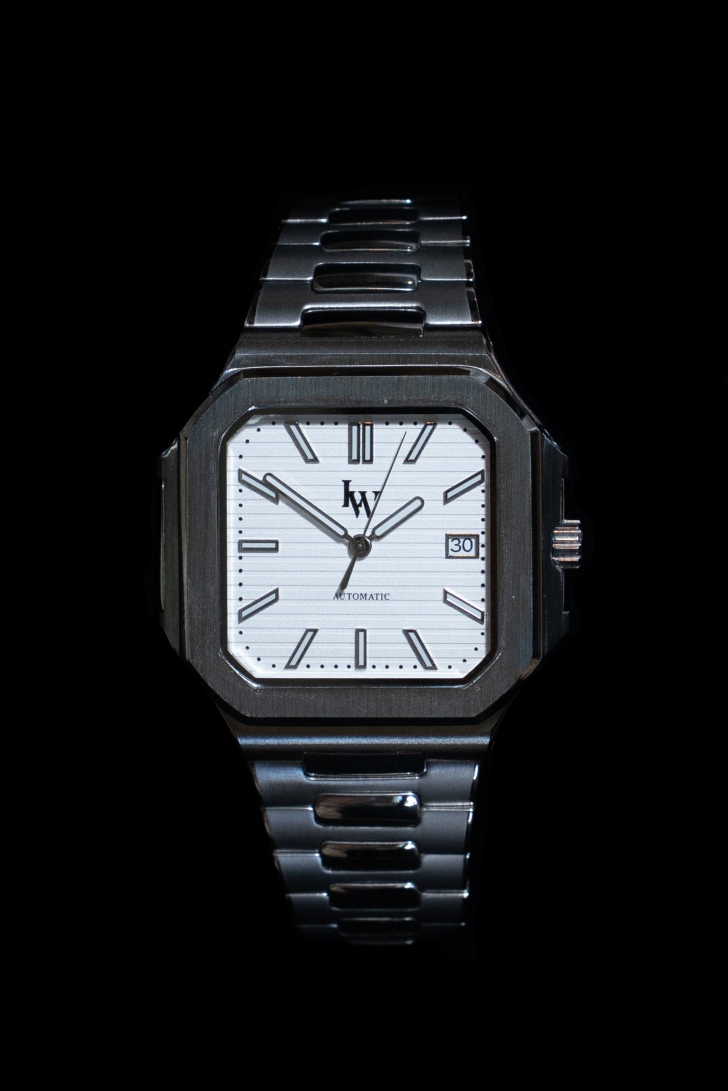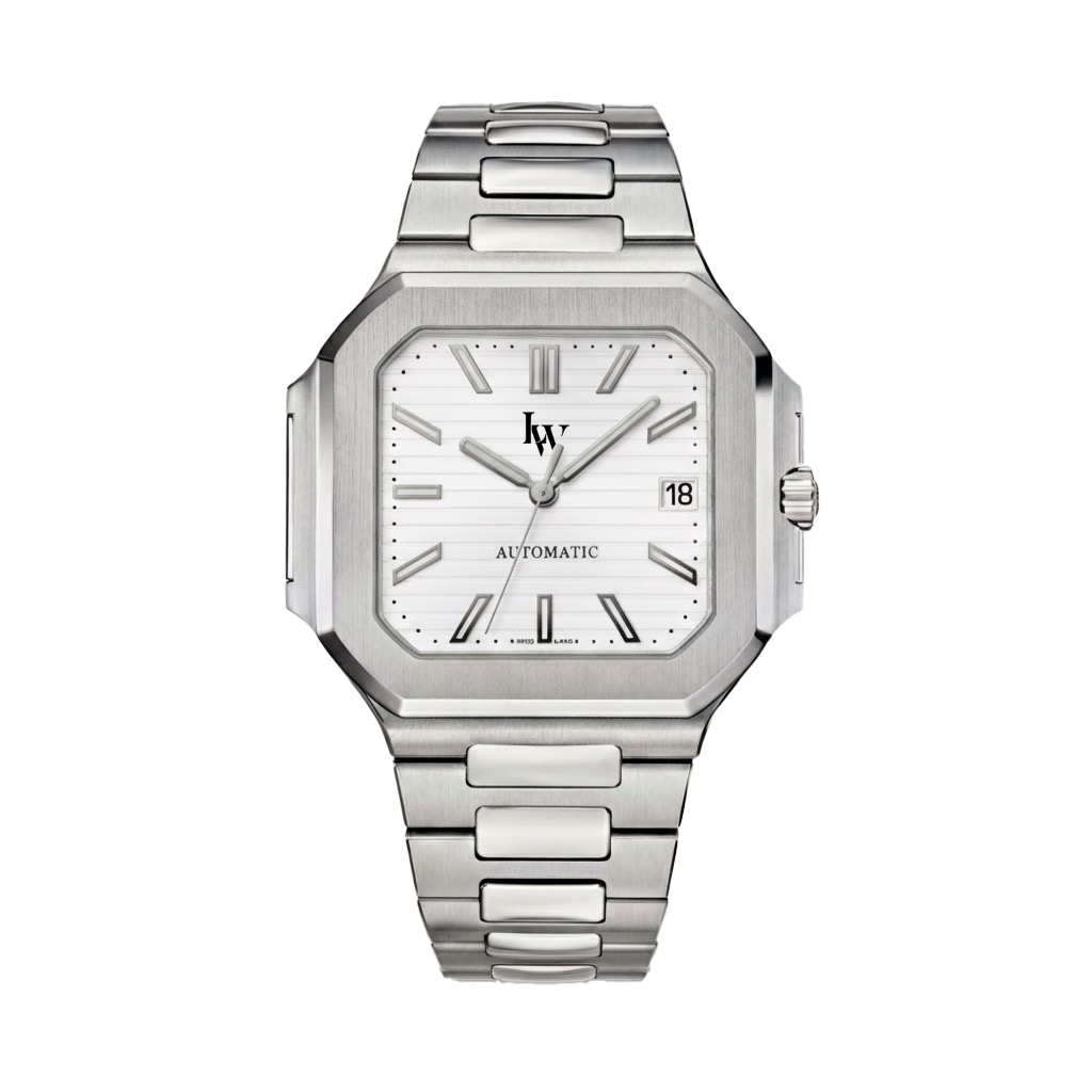 La sua cassa squadrata dalle linee nette e sofisticate incarna la forza dell’architettura moderna, mentre il quadrante bianco glaciale, con finitura a rilievo, riflette la luce con una purezza cristallina, evocando paesaggi innevati e silenzi eterni.