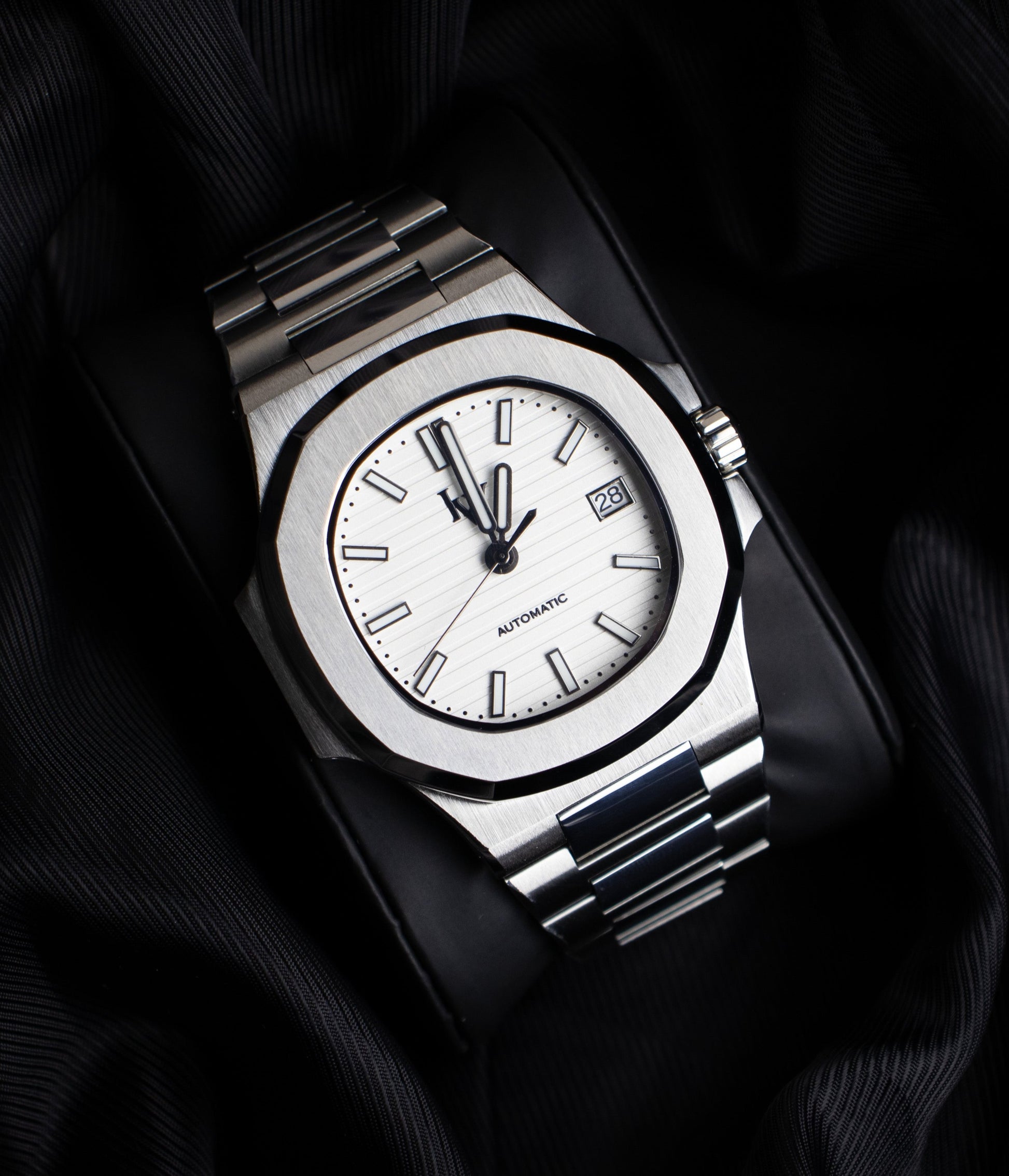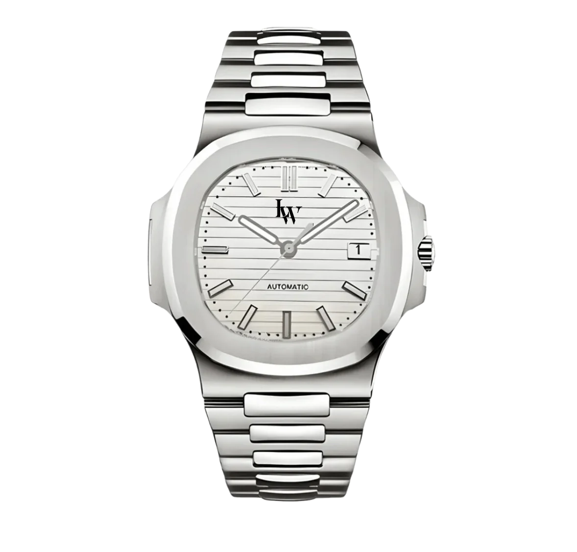 L'apice dell'eleganza e della precisione. Questo capolavoro meccanico presenta un quadrante bianco perla che trasuda raffinatezza senza tempo, perfettamente completato dalla sua cassa in argento lucido. Alimentato da un movimento eccezionalmente preciso, il Silver Horizon garantisce un cronometraggio impeccabile, mentre il suo design raffinato lo rende una vera dichiarazione di lusso. Realizzato per coloro che apprezzano i dettagli più fini, questo orologio è la miscela definitiva di arte e precisione.